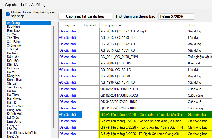 Phần mềm Dự toán F1 đã đăng tải toàn bộ dữ liệu giá thông báo vật liệu kèm theo công bố trên cho cả bản thương mại và bản miễn phí. Mọi người nhanh chóng cập nhật về để sử dụng nhé!