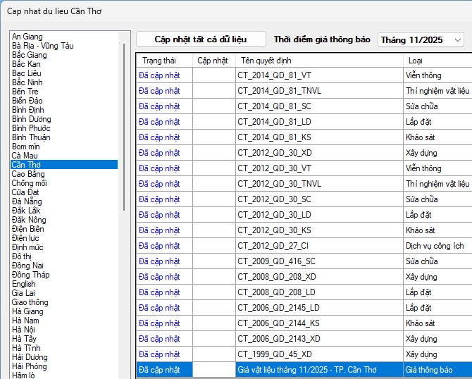 Ngày 10/12/2025, Sở Xây dựng TP. Cần Thơ ban hành Công bố số 4091/SXD-QLXD&CLCT. Về việc Công bố giá vật liệu xây dựng tại thời điểm tháng 11 năm 2025 trên địa bàn thành phố Cần Thơ.