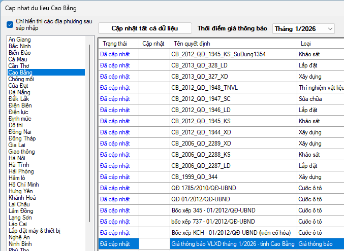 Ngày 26/01/2026, Sở Xây dựng tỉnh Cao Bằng ban hành Công bố số 92/SXD-VL. Giá gốc vật liệu xây dựng chủ yếu trên địa bàn tỉnh Cao Bằng thời điểm tháng 1 năm 2026.