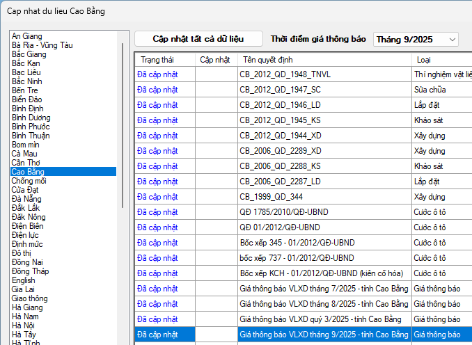Ngày 18/09/2025, Sở Xây dựng tỉnh Cao Bằng ban hành Công bố số 3786/SXD-KTVLXD. Giá gốc vật liệu xây dựng chủ yếu trên địa bàn tỉnh Cao Bằng thời điểm tháng 9 năm 2025.