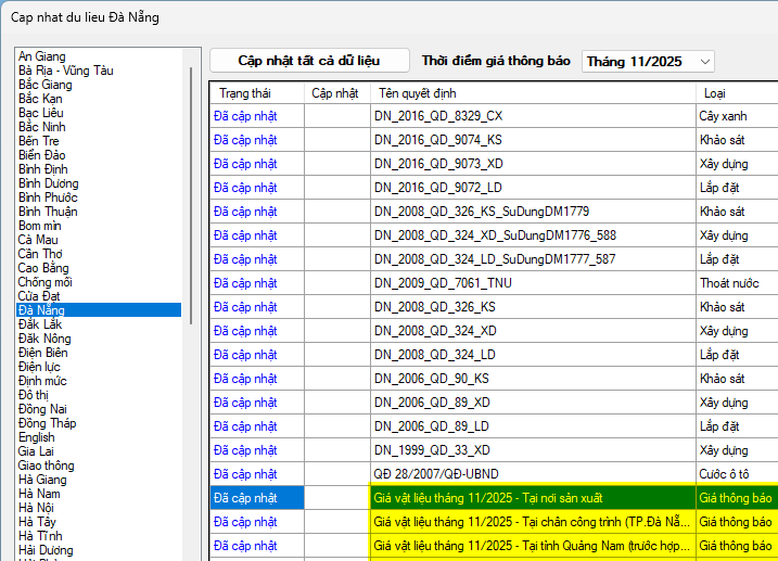 Đà Nẵng – Giá vật liệu tháng 11 năm 2025