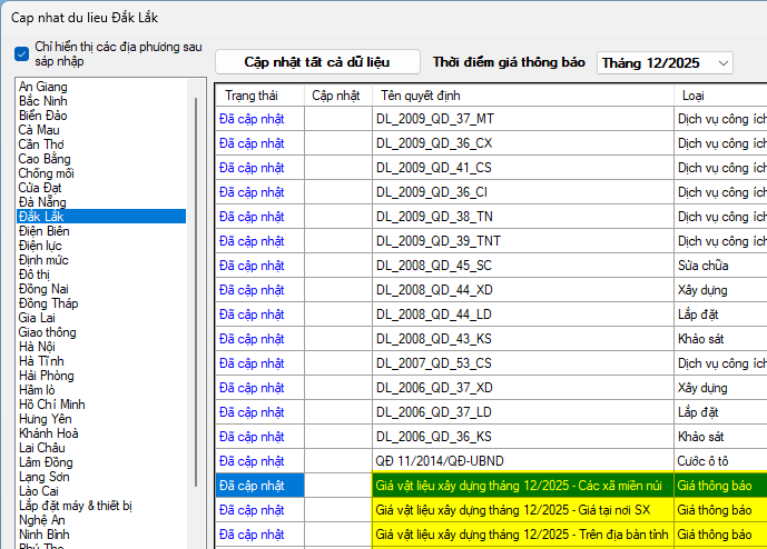 Đắk Lắk – Giá vật liệu tháng 12 năm 2025
