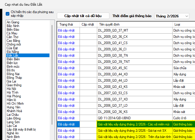 Ngày _/02/2026, Sở Xây dựng tỉnh Đắk Lắk ban hành Công bố số _/SXD-KT&VLXD. Về việc công bố thông tin giá vật liệu xây dựng tháng 2/2026.