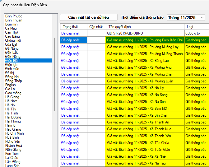 Ngày 28/11/2025, Sở Xây dựng tỉnh Điện Biên ban hành Công bố số 4559/CBGVLXD-SXD. Về việc công bố giá vật liệu xây dựng lưu thông trên thị trường thời điểm tháng 11 năm 2025 trên địa bàn tỉnh Điện Biên.
