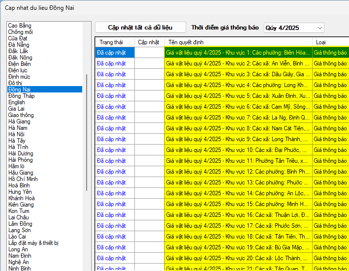 Phần mềm Dự toán F1 đã đăng tải toàn bộ dữ liệu giá thông báo vật liệu kèm theo công bố trên cho cả bản thương mại và bản miễn phí. Mọi người nhanh chóng cập nhật về để sử dụng nhé!