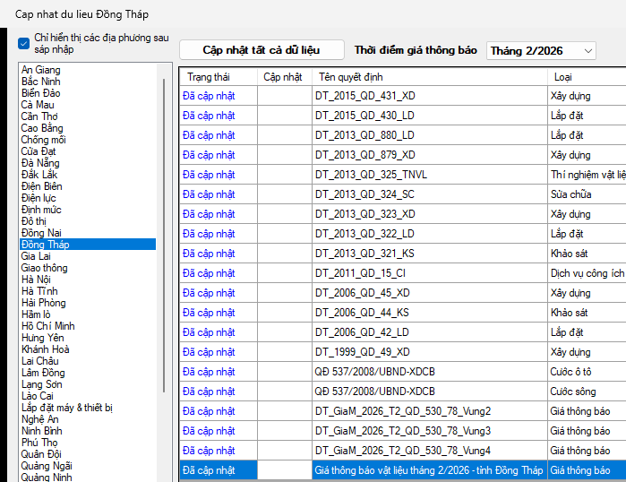 Ngày 13/03/2026, Sở Xây dựng tỉnh Đồng Tháp ban hành Thông báo số 2084/TB-SXD. Về việc công bố giá vật liệu xây dựng, thiết bị công trình; giá vật tư, thiết bị điện tại thời điểm tháng 2 năm 2026 trên địa bàn tỉnh Đồng Tháp.