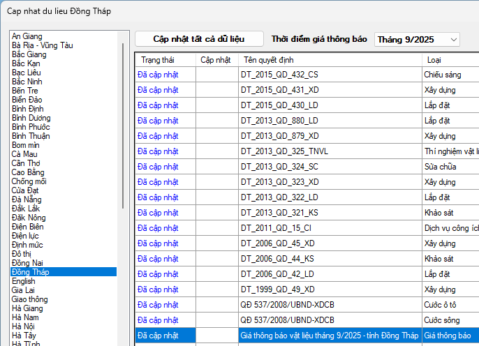 Đồng Tháp – Giá vật liệu tháng 9 năm 2025