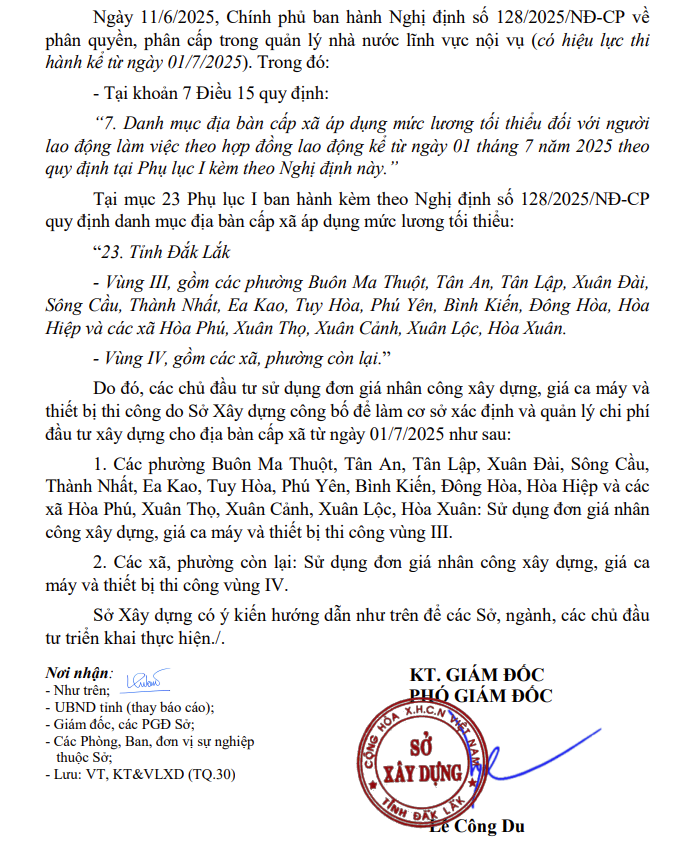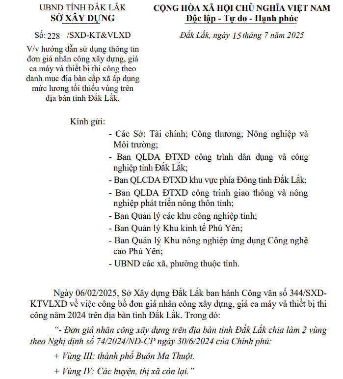 Ngày 15/07/2025, Sở Xây dựng tỉnh Đắk Lắk đã hướng dẫn sử dụng thông tin đơn giá nhân công xây dựng, giá ca máy và thiết bị thi công theo danh mục địa bàn cấp xã áp dụng mức lương tối thiểu vùng trên địa bàn tỉnh Đắk Lắk từ ngày 01/07/2025 theo văn bản số 228/SXD&KTVLXD
