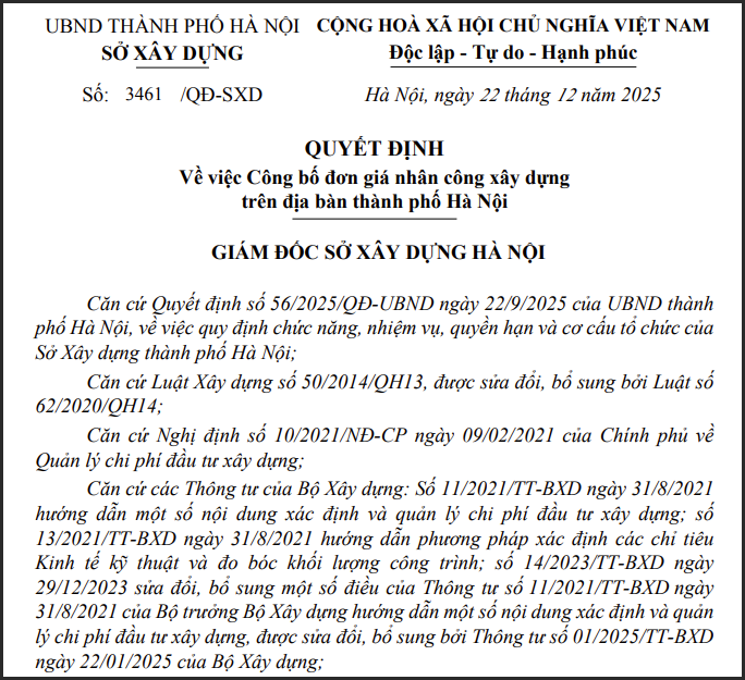 Ngày 22/12/2025, Sở Xây dựng Hà Nội đã công bố đơn giá nhân công xây dựng trên địa bàn thành phố theo quyết định số 3461/QĐ-SXD