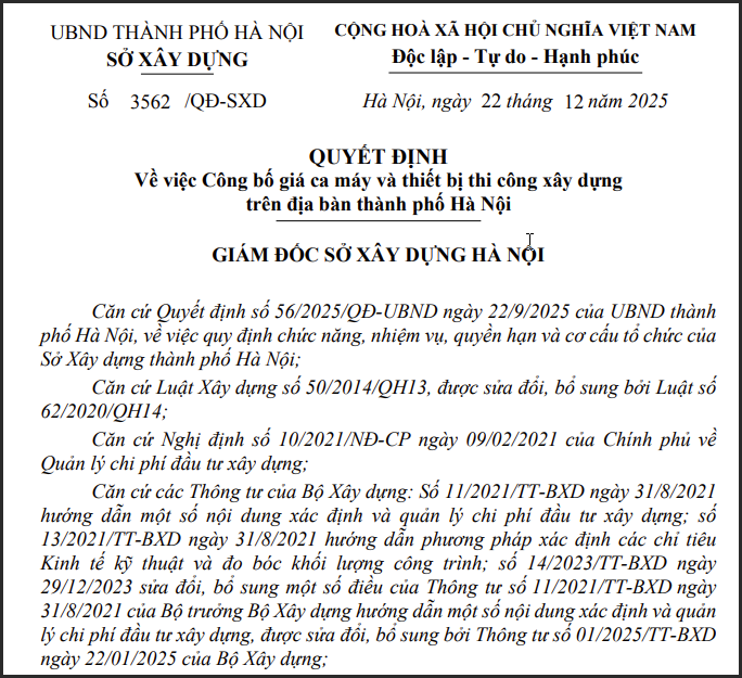 Cùng ngày, Sở Xây dựng tiếp tục công bố bảng giá ca máy và thiết bị thi công xây dựng theo quyết định số 3562/QĐ-SXD