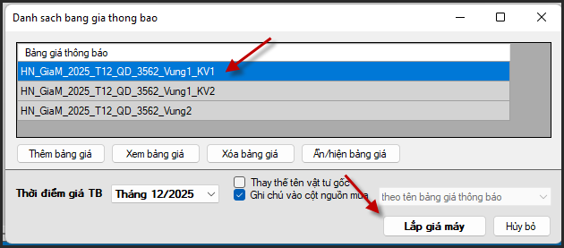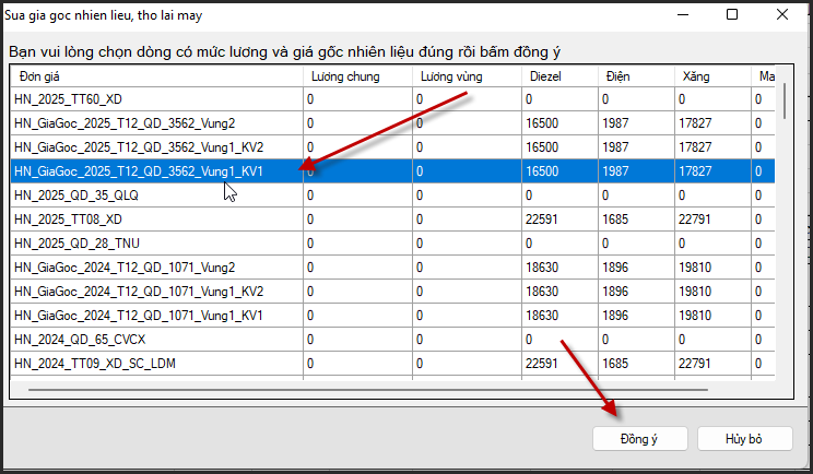 Chọn giá gốc của quyết định giá ca máy 3562 theo Vùng-khu vực/Đồng ý