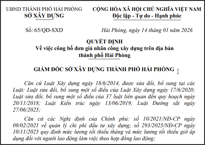 Ngày 14/01/2026, Sở Xây dựng thành phố Hải Phòng đã công bố đơn giá nhân công xây dựng theo quyết định số 65479/QĐ-SXD
