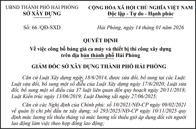 Cùng ngày, Sở Xây dựng Hải Phòng tiếp tục công bố bảng giá ca máy và thiết bị thi công xây dựng theo quyết định số 66/QĐ-SXD