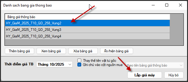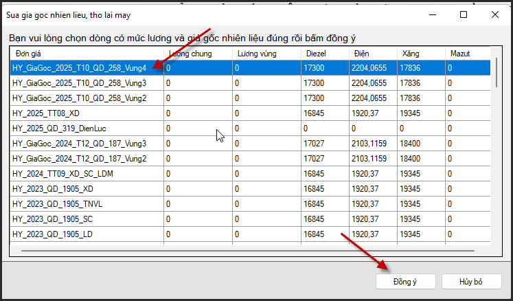 Chọn giá gốc của quyết định giá ca máy 258 theo Vùng/Đồng ý