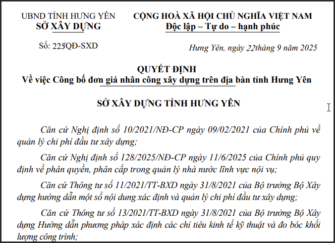 Ngày 22/9/2025, Sở Xây dựng tỉnh Hưng Yên đã công bố đơn giá nhân công xây dựng trên địa bàn tỉnh theo quyết định số 225/QĐ-SXD