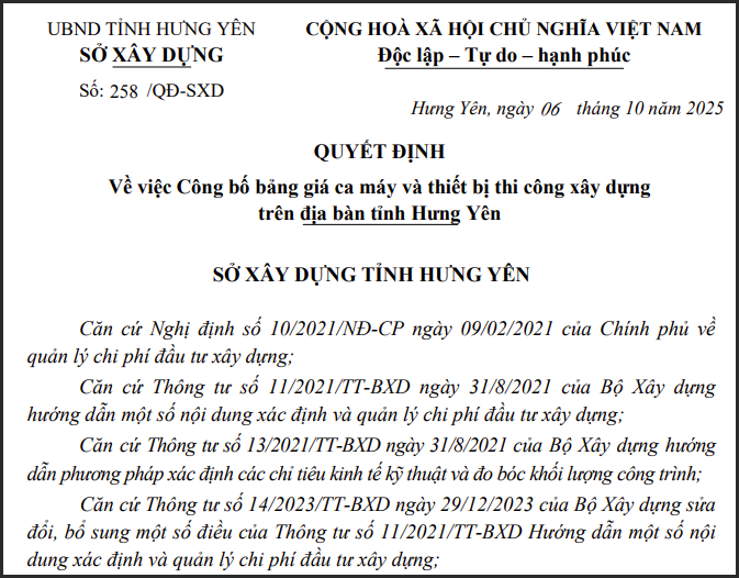 Ngày 06/10/2025, Sở Xây dựng tỉnh Hưng Yên công bố bảng giá ca máy và thiết bị thi công xây dựng công trình theo quyết định số 258/QĐ-SXD.