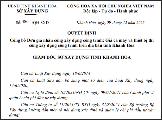Ngày 09/12/2025, Ủy ban nhân dân tỉnh Khánh Hòa đã công bố đơn giá nhân công xây dựng, giá ca máy và thiết bị thi công xây dựng trên địa bàn tỉnh Khánh Hòa theo quyết định số 486/QĐ-SXD