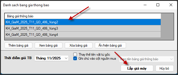 Chọn giá gốc của quyết định giá ca máy 486 theo Vùng/Đồng ý