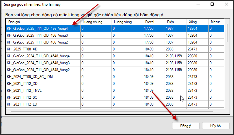 Nhấp chuột trái vào giá tiền của nhiên liệu và điện để lắp giá mới nhất/Áp bù giá