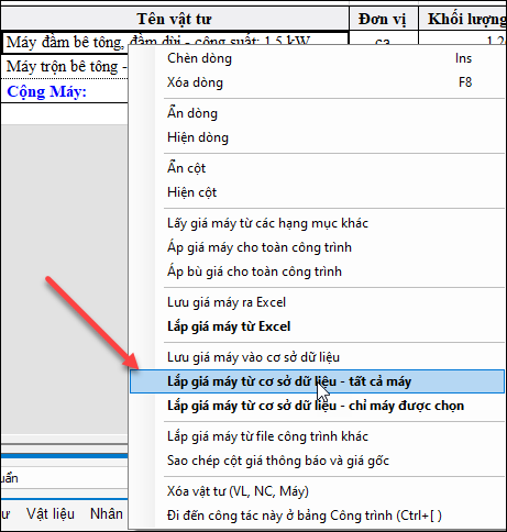 2. Tại sheet Máy thi công: nhấp chuột phải vào trong lòng bảng/Lắp giá máy từ cơ sở dữ liệu – tất cả máy