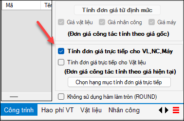 3. Quay trở về sheet Công trình: tích chọn “Tính đơn giá trực tiếp cho VL, NC, Máy” và làm theo thông báo hướng dẫn hiện ra tiếp sau đó