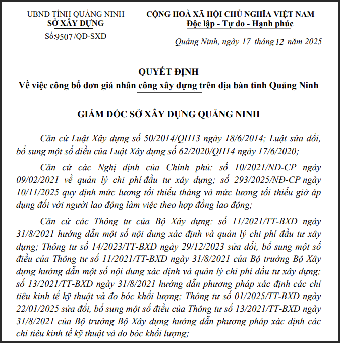 Ngày 17/12/2025, Sở Xây dựng tỉnh Quảng Ninh đã công bố đơn giá nhân công xây dựng theo quyết định số 9507/QĐ-SXD