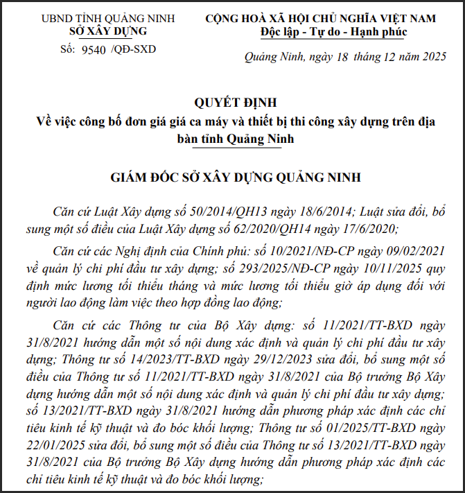 Ngày 18/12/2025, Sở Xây dựng tỉnh Quảng Ninh công bố giá ca máy và thiết bị thi công xây dựng theo quyết định số 9540/QĐ-SXD.
