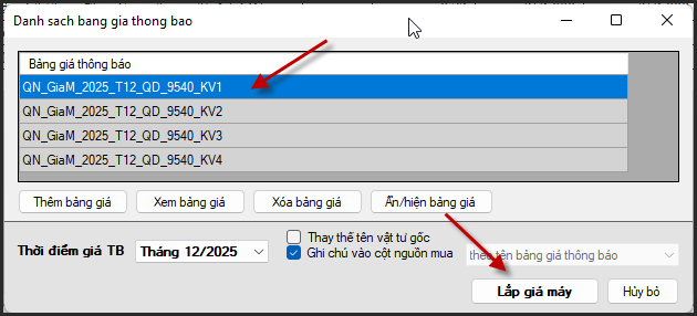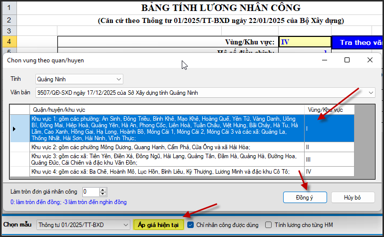 Chọn giá gốc theo Vùng của quyết định giá ca máy 9540/Đồng ý