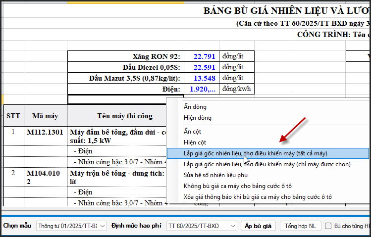 2. Tại sheet Máy thi công: nhấp chuột phải vào trong lòng bảng/Lắp giá máy từ cơ sở dữ liệu – tất cả máy