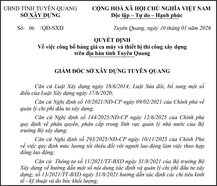 Ngày 10/01/2026, Sở Xây dựng tỉnh Tuyên Quang công bố bảng giá ca máy và thiết bị thi công trên địa bàn tỉnh theo quyết định số 06/QĐ-SXD