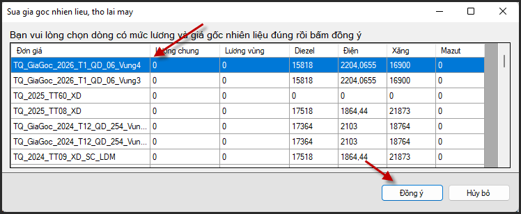 Nhấp chuột trái vào giá tiền của nhiên liệu và điện để lắp giá mới nhất/Áp bù giá