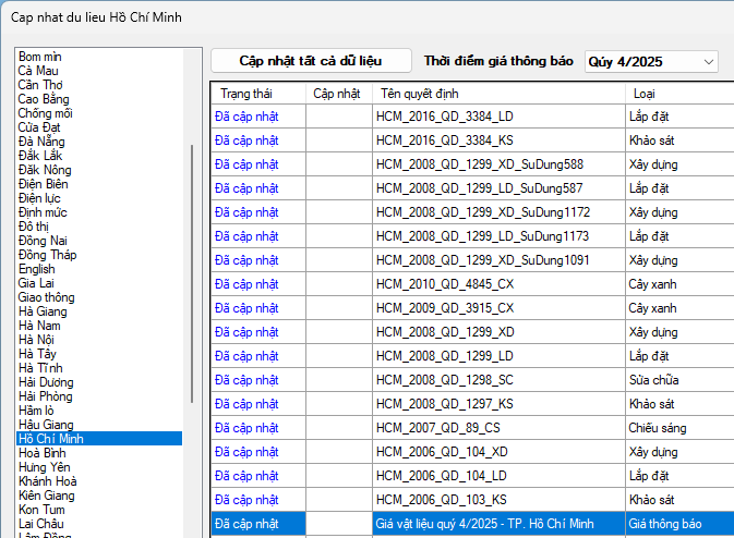 Hồ Chí Minh – Giá vật liệu quý 4 năm 2025