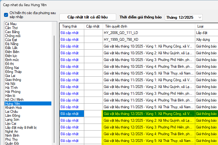 Ngày 26/12/2025, Sở Xây dựng tỉnh Hưng Yên ban hành Công bố số 12/CB-SXD. Về việc công bố giá vật liệu xây dựng, thiết bị công trình tháng 12 năm 2025 trên địa bàn tỉnh Hưng Yên.