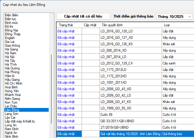 Lâm Đồng – Giá vật liệu tháng 9 và 10 năm 2025
