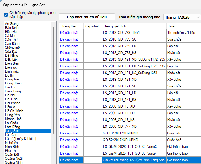 Ngày 13/01/2026, Sở Xây dựng tỉnh Lạng Sơn ban hành Công bố số 01/CBGVLXD-SXD. Về việc công bố giá các loại vật liệu xây dựng trên địa bàn tỉnh Lạng Sơn tại thời điểm tháng 12 năm 2025.