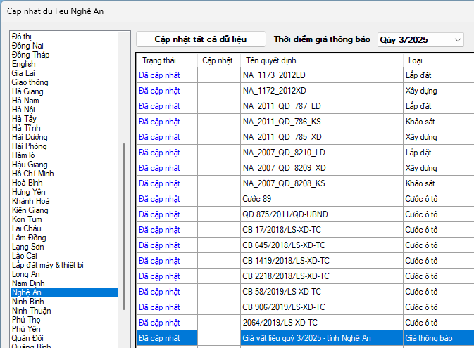 Nghệ An – Giá vật liệu quý 3 năm 2025