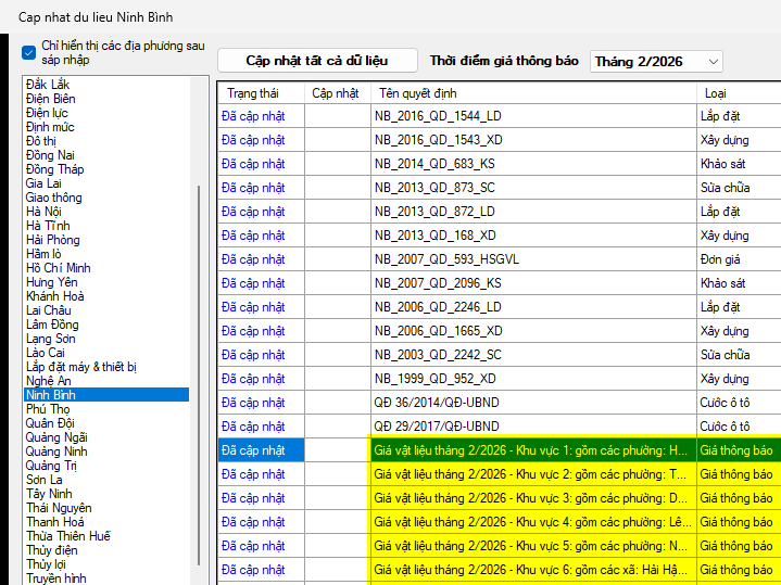 Ninh Bình – giá vật liệu tháng 2 năm 2026