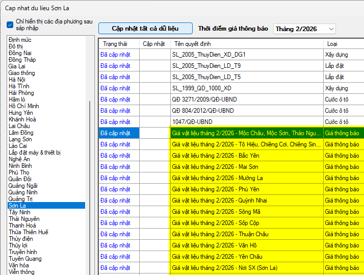 Trên cơ sở ý kiến tham gia của các Sở, ngành và Hiệp hội doanh nghiệp tỉnh, Sở Xây dựng công bố thông tin giá vật liệu xây dựng trên địa bàn tỉnh Sơn La tháng 2 năm 2026. Công bố thông tin giá vật liệu xây dựng trên địa bàn tỉnh Sơn La trong bảng giá kèm theo (giá vật liệu xây dựng được công bố chưa bao gồm thuế giá trị gia tăng).
