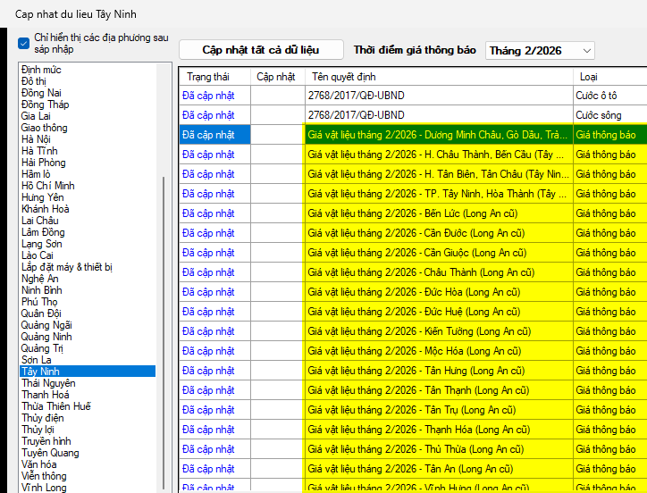 Tây Ninh – Giá vật liệu tháng 2 năm 2026
