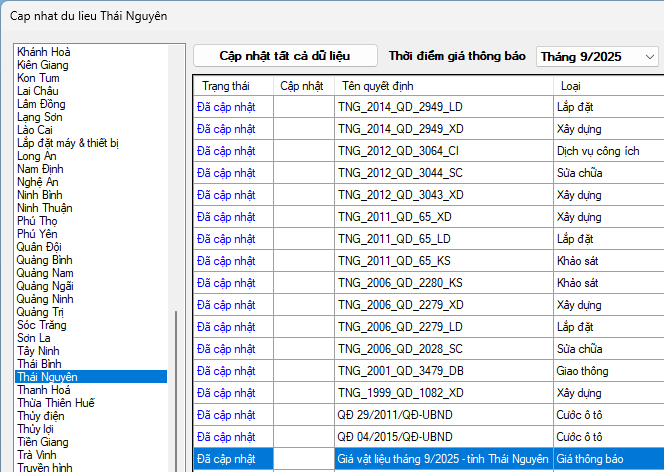 Ngày 06/10/2025, Sở Xây dựng tỉnh Thái Nguyên ban hành công bố số 2501/SXD-QLKT&VL. Về việc công bố giá vật liệu xây dựng, thiết bị công trình tháng 9 năm 2025 trên địa bàn tỉnh Thái Nguyên.