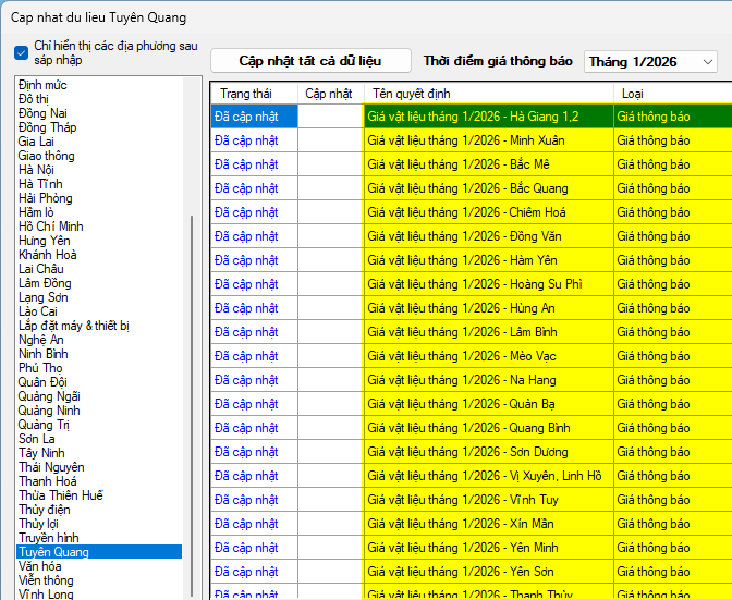 Tuyên Quang – Giá vật liệu tháng 1 năm 2026