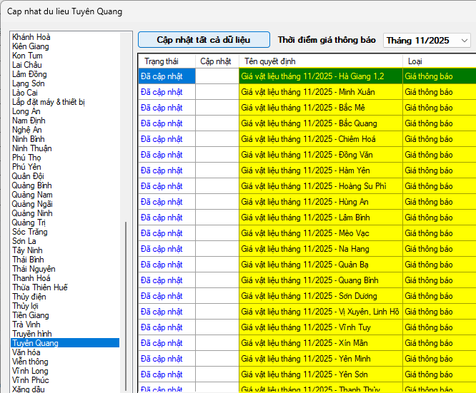 Tuyên Quang – Giá vật liệu tháng 11 năm 2025