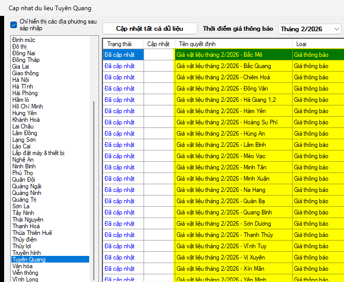 Ngày 10/03/2026, Sở Xây dựng tỉnh Tuyên Quang ban hành Công bố số 108/TB-SXD. Về việc công bố các thông tin về giá một số loại vật liệu xây dựng chủ yếu trên địa bàn tỉnh Tuyên Quang (tháng 2 năm 2026).