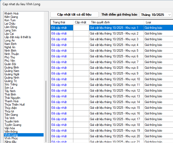Sở Xây dựng công bố giá vật liệu xây dựng tháng 10 năm 2025 trên địa bàn tỉnh Vĩnh Long theo Phụ lục I, II, III đính kèm thông báo này làm cơ sở để chủ đầu tư, đơn vị tư vấn tham khảo sử dụng để xác định tổng mức đầu tư xây dựng, dự toán xây dựng và quản lý chi phí đầu tư xây dựng công trình trên địa bàn tỉnh.