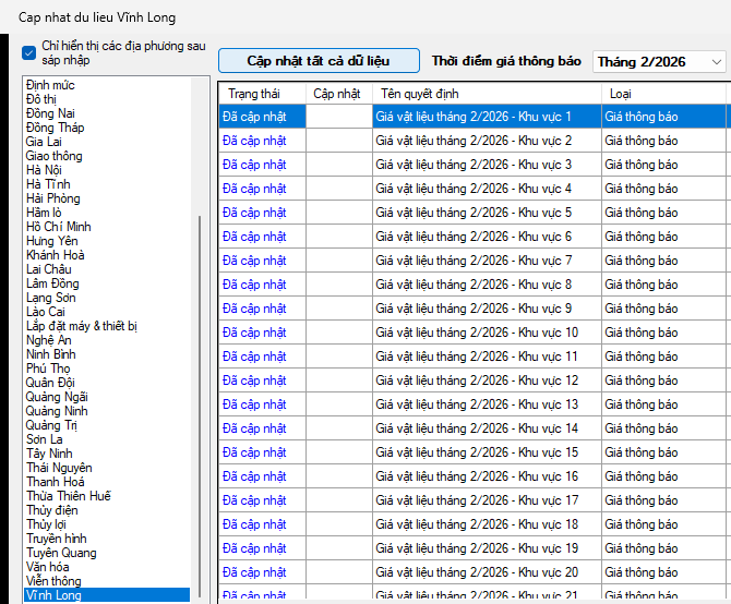 Sở Xây dựng công bố giá vật liệu xây dựng tháng 2 năm 2026 trên địa bàn tỉnh Vĩnh Long theo Phụ lục I, II, III đính kèm thông báo này làm cơ sở để chủ đầu tư, đơn vị tư vấn tham khảo sử dụng để xác định tổng mức đầu tư xây dựng, dự toán xây dựng và quản lý chi phí đầu tư xây dựng công trình trên địa bàn tỉnh.