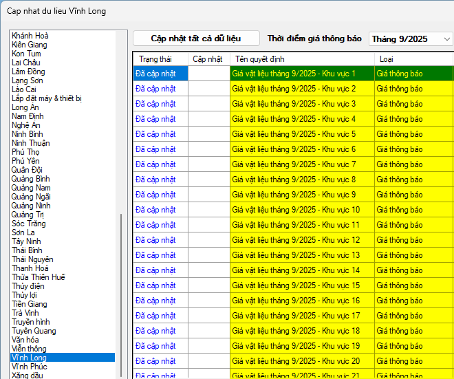 Phần mềm Dự toán F1 đã đăng tải toàn bộ dữ liệu giá thông báo vật liệu kèm theo công bố trên cho cả bản thương mại và bản miễn phí. Mọi người nhanh chóng cập nhật về để sử dụng nhé!